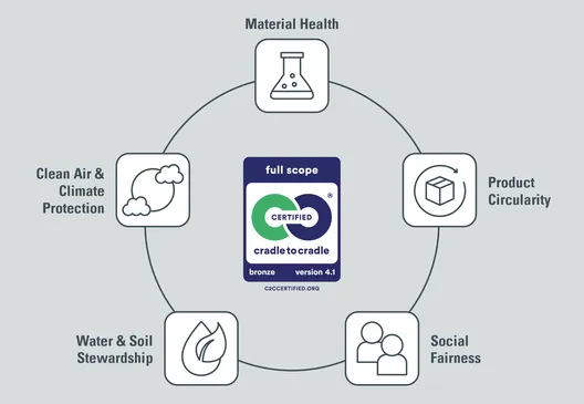 The cradle to cradle certificate was awarded after an extensive review process. Five categories were evaluated.