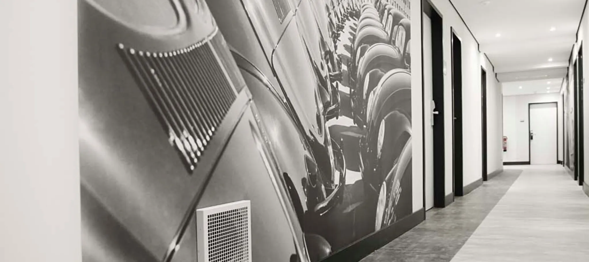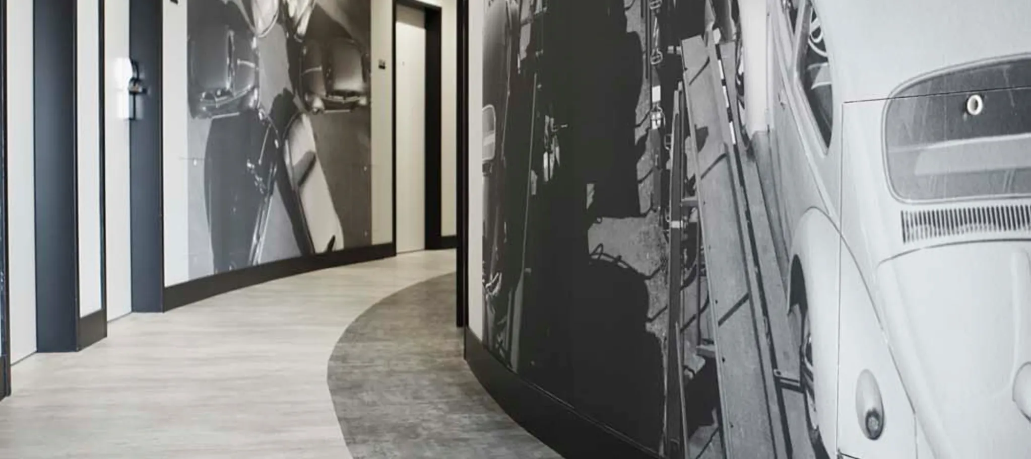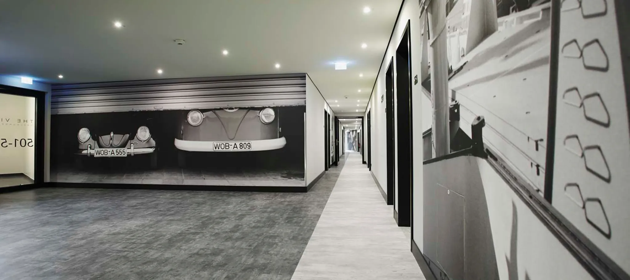 The architect delivered the connection between the history of the hotel’s development with the famous VW company in Wolfsburg in their design of the interior public areas. The walls of the corridors are covered with full height photographic images from the Volkswagen era. The reduction of the colour palette to black and white for walls, doors and floors emphasises the effect of the monochrome photographs.